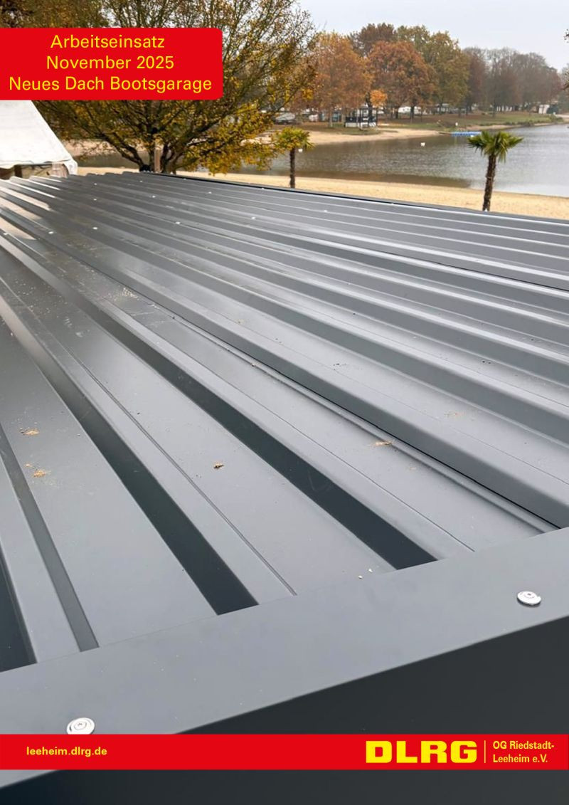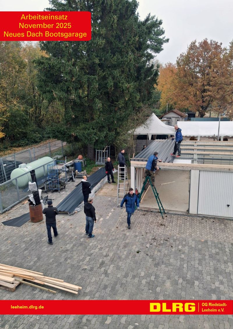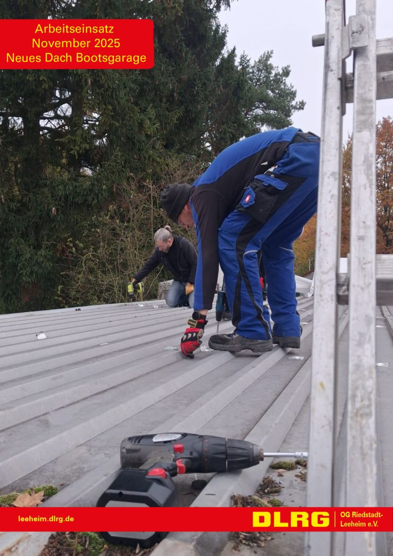 Unter diesem Motto liefen Anfang November zwei arbeitsreiche Samstage an der DLRG Station am Riedsee ab. Im Inneren der Bootsgarage hat nach Regenfällen immer wieder Wasser angesammelt. Das war weder für die Boote noch das restliche Material in der Garage zuträglich. Diesen Zustand konnten wir nun mit neuem Material für die Dachsanierung endlich beheben. Viele fleißige Hände entfernten erst das alte Dach und putzten rund um die Garage aus. Dann konnte das neue Material, das uns von der Stadt Riedstadt zur Verfügung gestellt wurde, verbaut werden. Jetzt ist die Garage wieder dicht ist und Boote und Material sind wieder sicher gelagert. Für gute Laune sorgte auch die leckere Verpflegung aller Helfer.