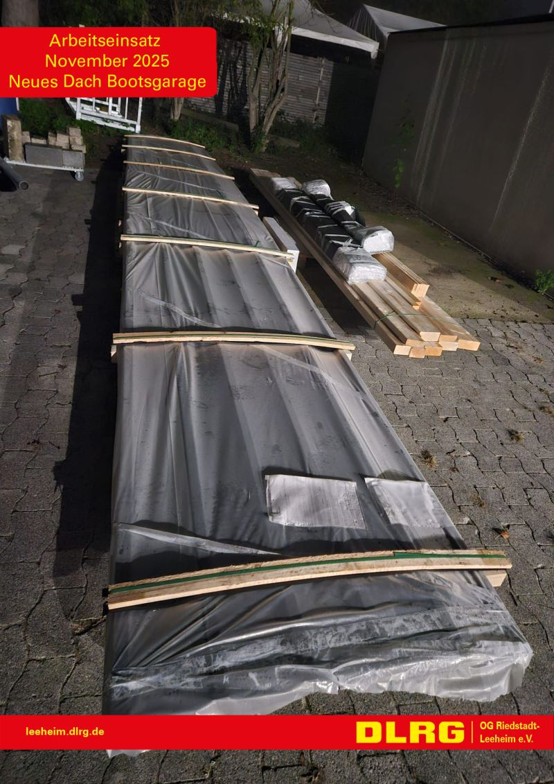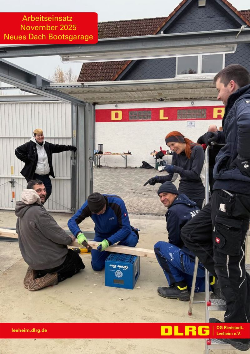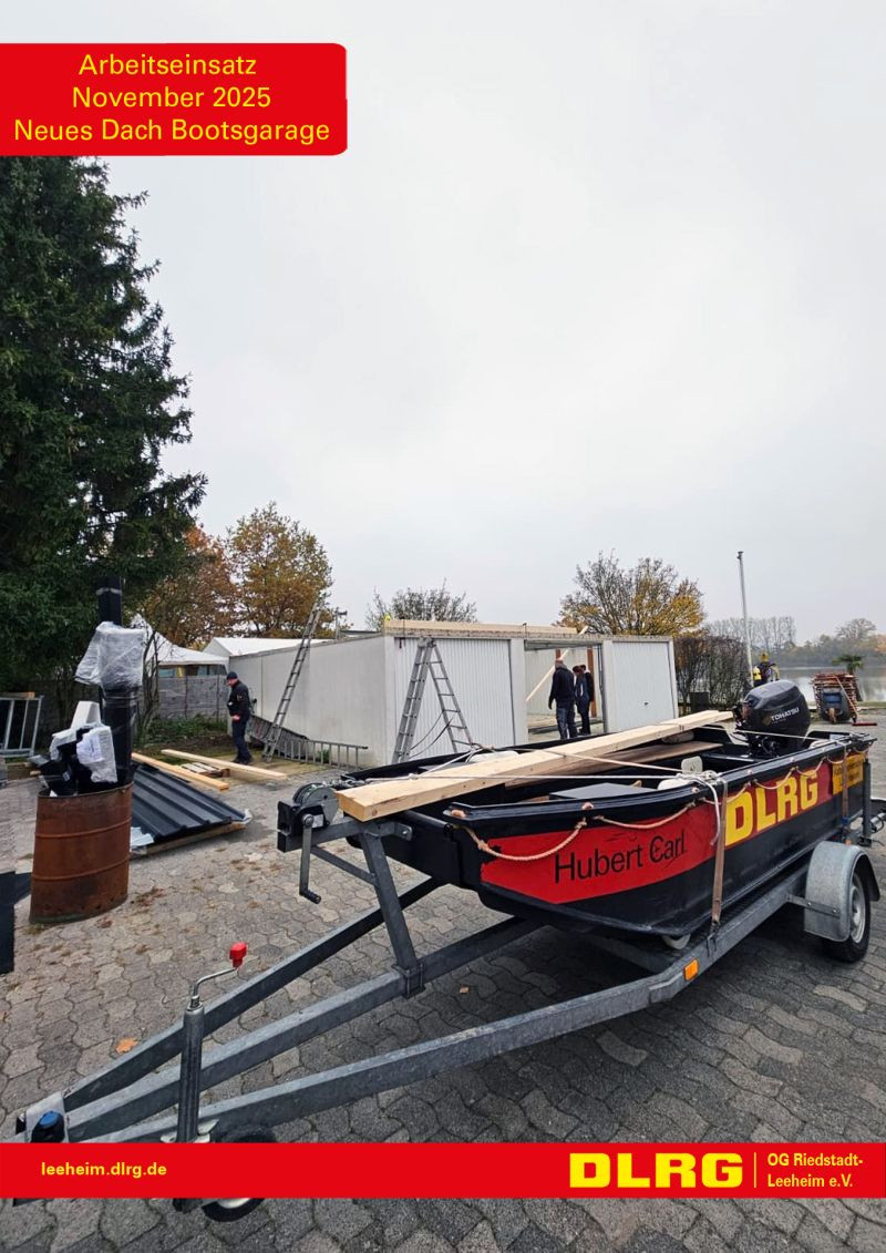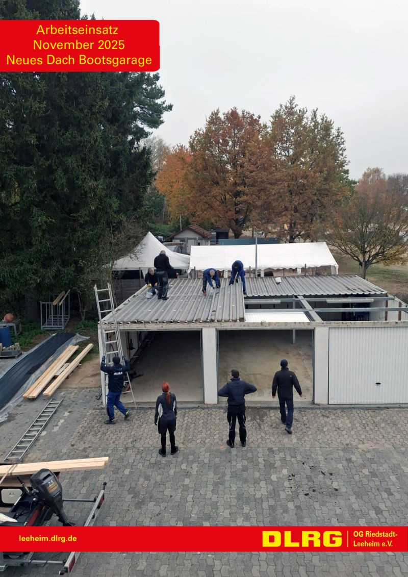 Unter diesem Motto liefen Anfang November zwei arbeitsreiche Samstage an der DLRG Station am Riedsee ab. Im Inneren der Bootsgarage hat nach Regenfällen immer wieder Wasser angesammelt. Das war weder für die Boote noch das restliche Material in der Garage zuträglich. Diesen Zustand konnten wir nun mit neuem Material für die Dachsanierung endlich beheben. Viele fleißige Hände entfernten erst das alte Dach und putzten rund um die Garage aus. Dann konnte das neue Material, das uns von der Stadt Riedstadt zur Verfügung gestellt wurde, verbaut werden. Jetzt ist die Garage wieder dicht ist und Boote und Material sind wieder sicher gelagert. Für gute Laune sorgte auch die leckere Verpflegung aller Helfer.