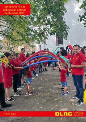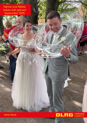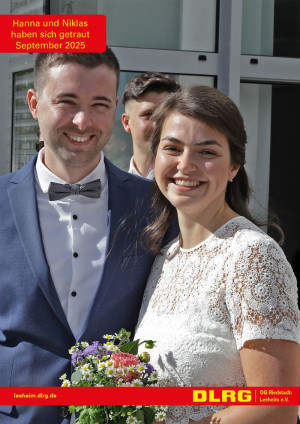 Sie kennen und lieben sich schon sehr lange. Daher wurde in ihrer Beziehung der nächste Schritt getan. Im September 2025 gaben sich unser technischer Leiter Einsatz Niklas und seine Hanna auf dem Standesamt und danach in der Kirche das Ja-Wort. Vor der Kirche wartete ein Spalier aus Poolnudeln und Flossen, mit dem die DLRG Kameradinnen und Kameraden einen guten Weg für das frisch vermählte Paar in ihre gemeinsame Zukunft bereiteten.